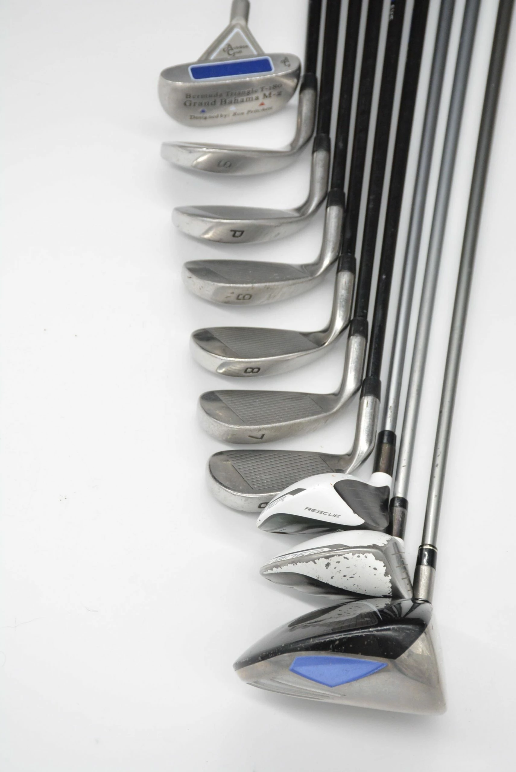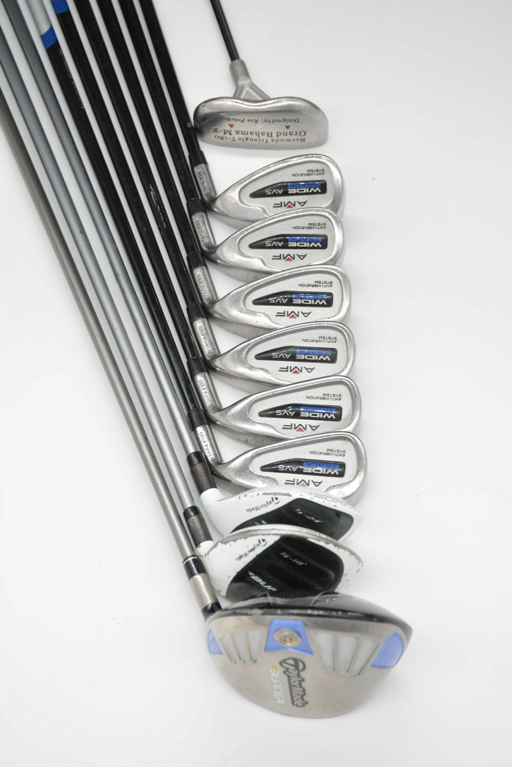 Set includes a TaylorMade Burner HT Driver, TaylorMade Burner Superfast 2.0 5 Wood, TaylorMade Burner Superfast 2.0 5 Hybrid, AMF Wide Track AVS Irons 6-PW, SW, and a 35.5in Ashton Golf Bermuda Triangle T-180 Grand Bahama M-2 Putter. Irons are in good condition, with normal-moderate wear to their heads and faces. Shafts are stock AMF graphite shafts in W Flex with stock AMF Grips. Shafts are .5in longer than standard length.