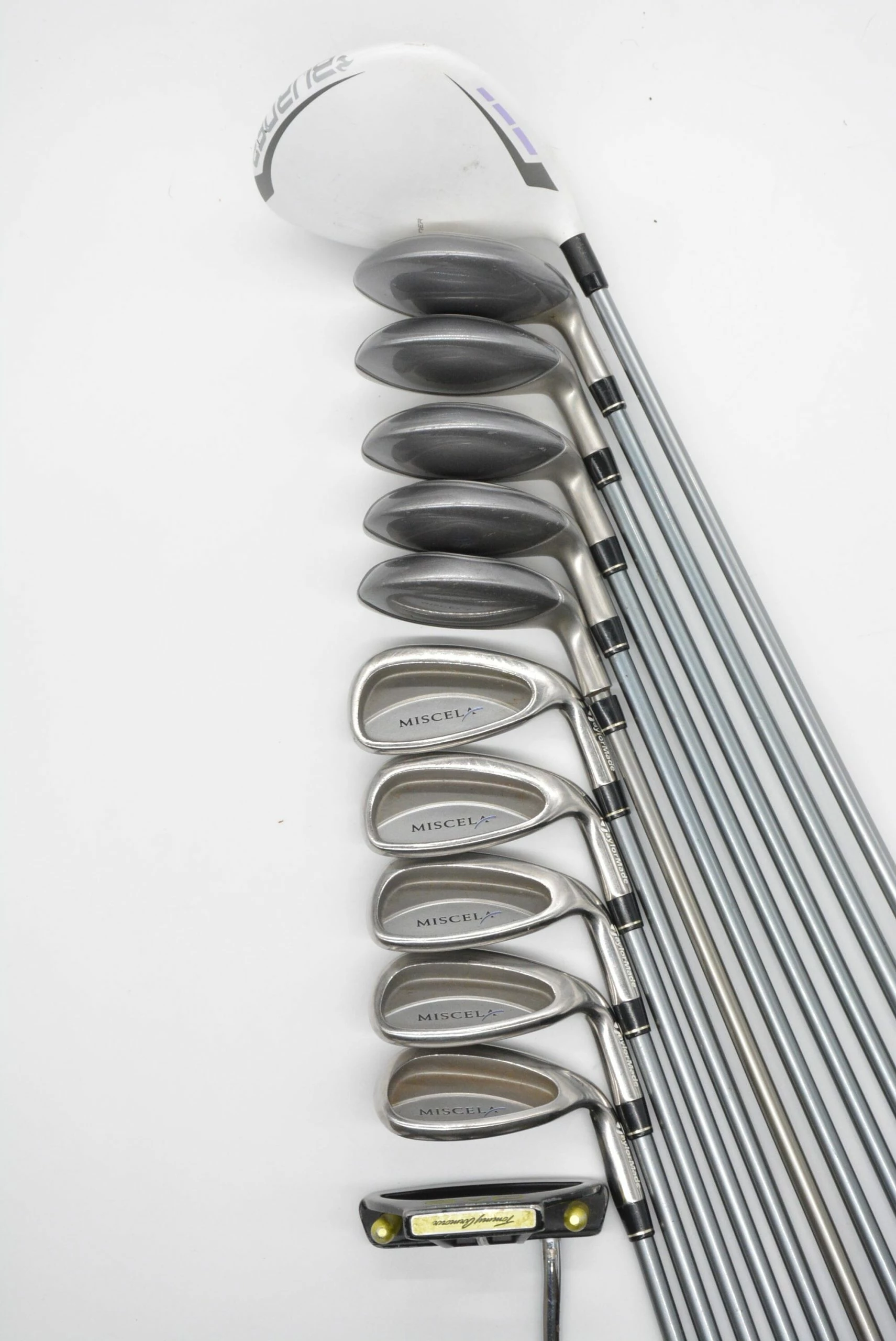 Set includes a TaylorMade Burner Superfast 20 Driver, a TaylorMade Miscela 3 Wood, TaylorMade Miscela 4, 5, & 6 Hybrids, a TaylorMade Miscela 5 Rescue Hybrid, TaylorMade Miscela Irons 7-SW, and a Tommy Armour EVO 35.5 in. Putter. Irons are in good condition with light wear to the heads and faces, with stock shafts in Ladies’ flex and stock grips.